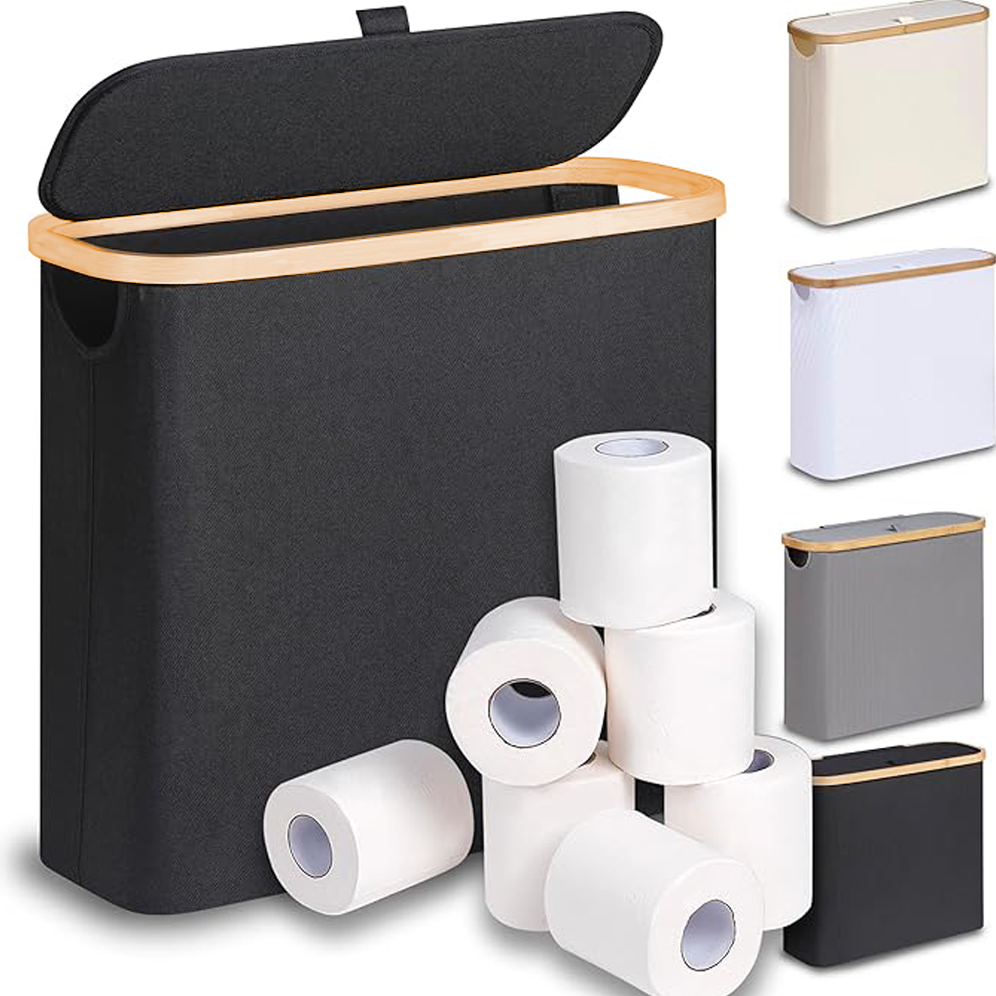 The toilet paper storage is made of Oxford fabric. The thick Oxford fabric is durable, not easy to damage, light in weight, breathable and easy to clean. It also has a bamboo handle and lid for easy movement and access to rolls.
